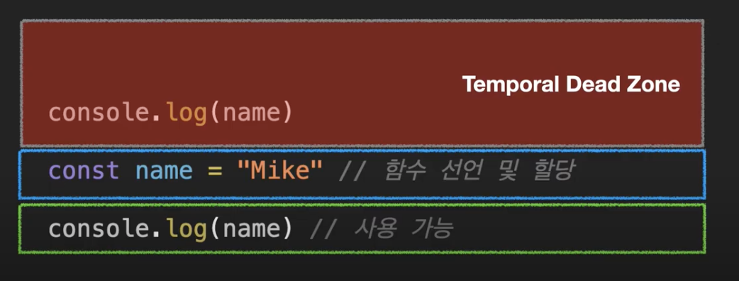 변수가 초기화되는 순간 TDZ에서 나오게 되며 사용할 수 있게 된다