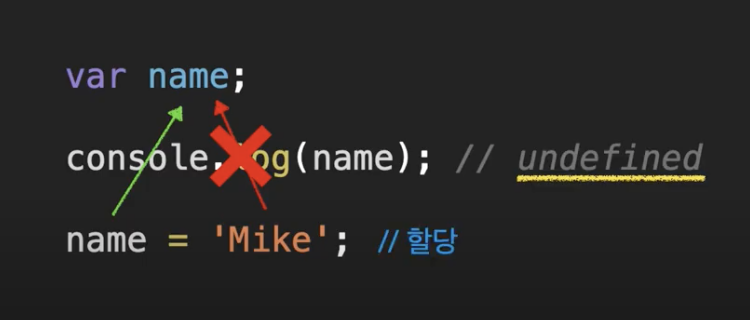 선언은 호이스팅되지만 할당은 호이스팅 되지 않기 때문에 console.log에 undefined가 출력된다
